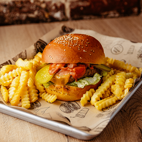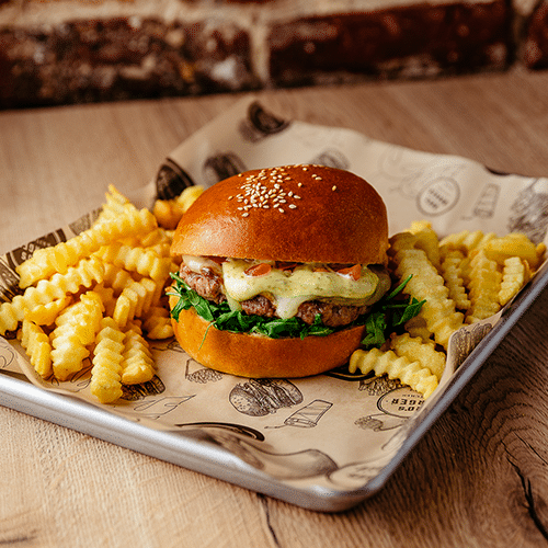 Boeuf irlandais, sauce Bro's, cheddar, salade de saison, oignons caramélisés, tomates.