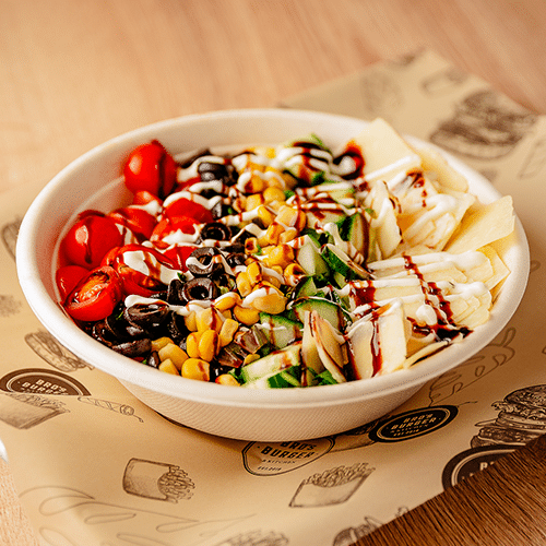 Toutes nos salades sont composées de salade de saison, tomate, concombre, olive, maïs, balsamique et sa vinaigrette.